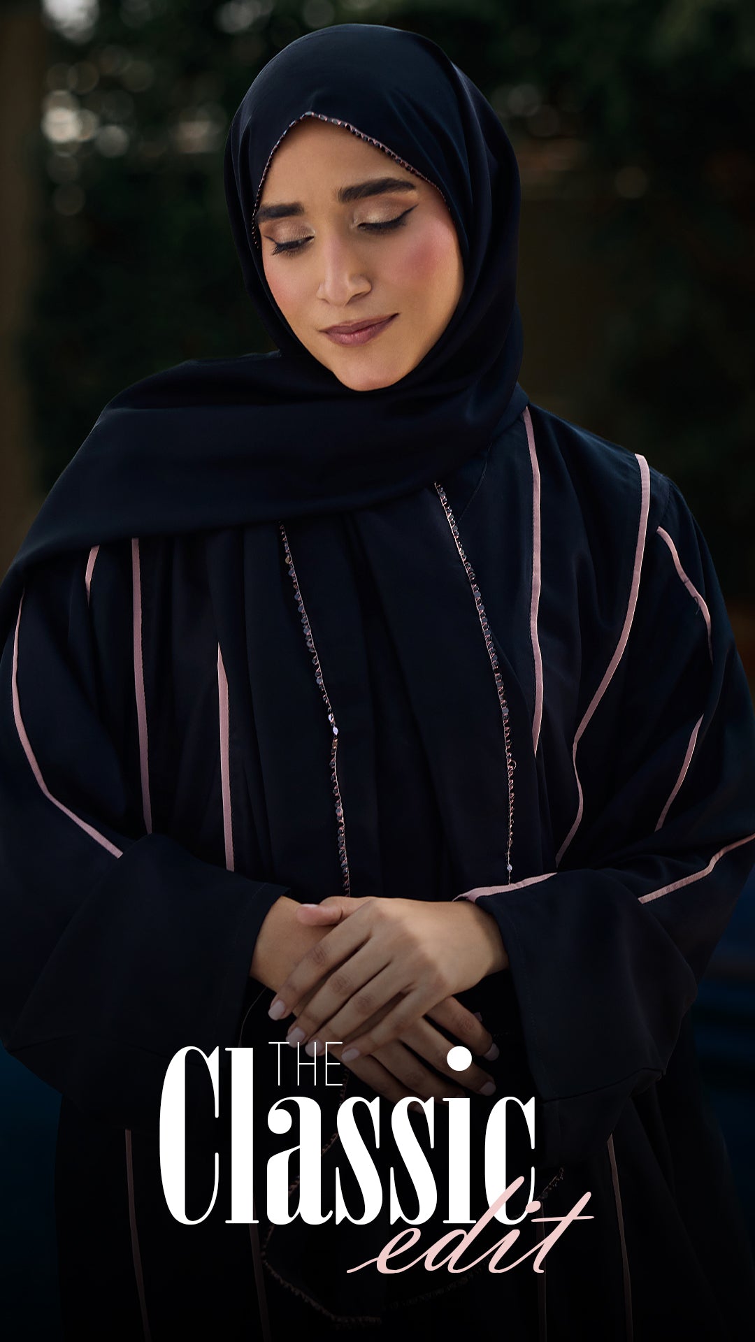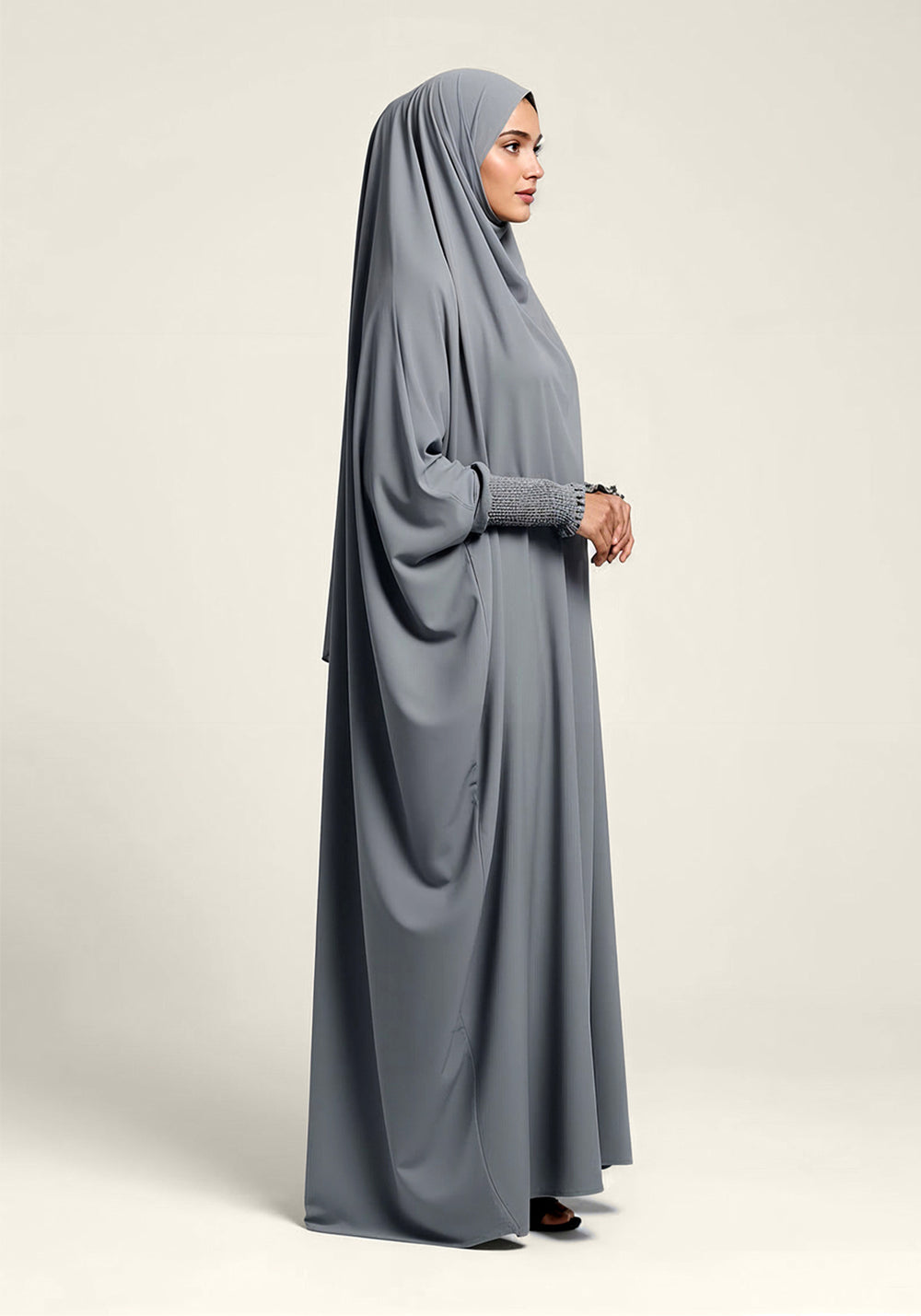 Feeling beautiful and elegant, our grey and black Zenda abaya is the one for you! It has a black inner with a grey upper with embroidery on the sleeves. A cool twist of modern design, this abaya will keep you comfortable and stylish.