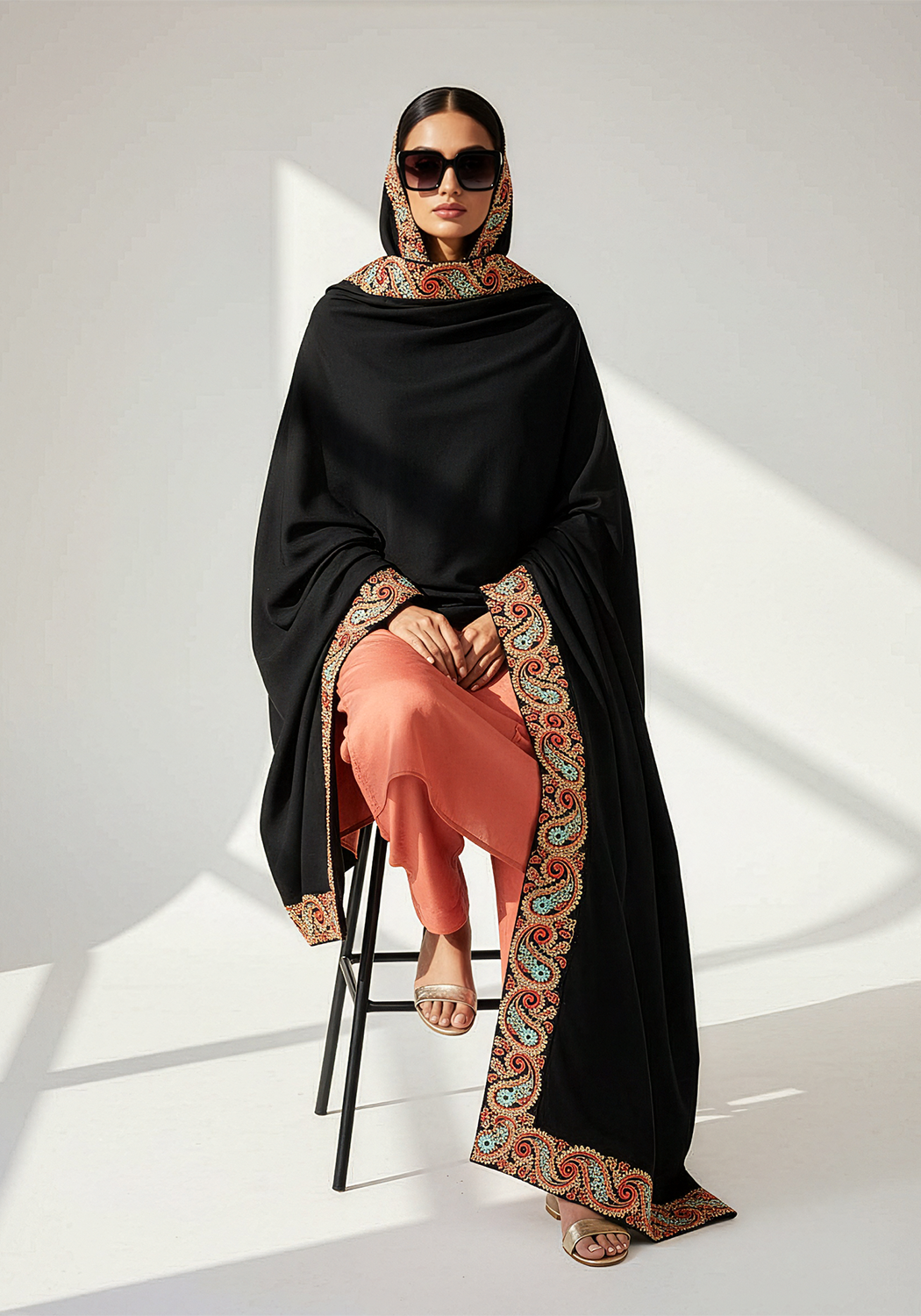 Product Description: This has a beautiful multicolor motif design embroidered neatly on the borders of this Chiffon black Chadar.