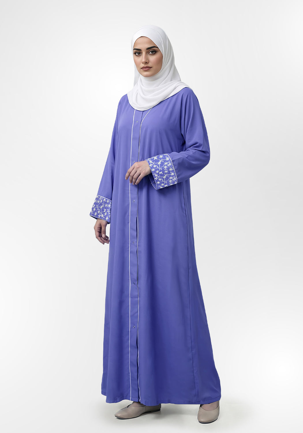 Designed to celebrate the bond between mother and daughter, our Ferozi Sleeves Embroidery Abaya from the Mom & Me Collection is crafted in soft Woolpeach fabric. The delicate white floral embroidery on the sleeves adds a charming touch