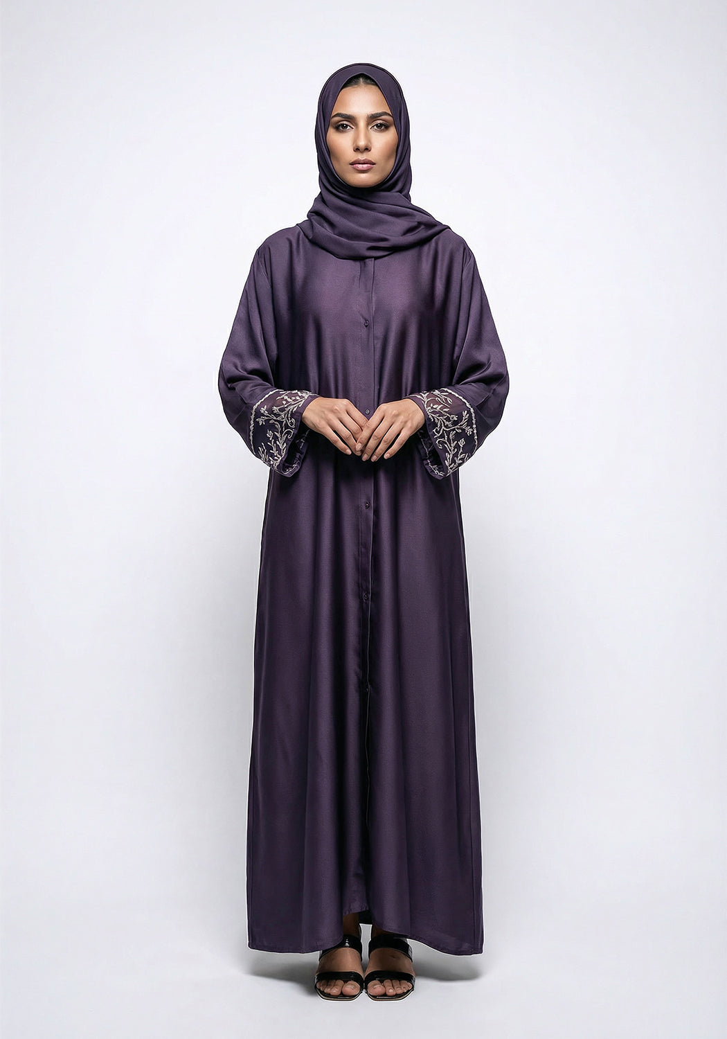 This elegant abaya features luxurious Nida fabric, offering a smooth and comfortable drape. The standout detail is the intricate Dapka work adorning the sleeves, adding a refined touch of craftsmanship. Perfect for those seeking a sophisticated and graceful look, this purple abaya combines timeless style with subtle embellishment.