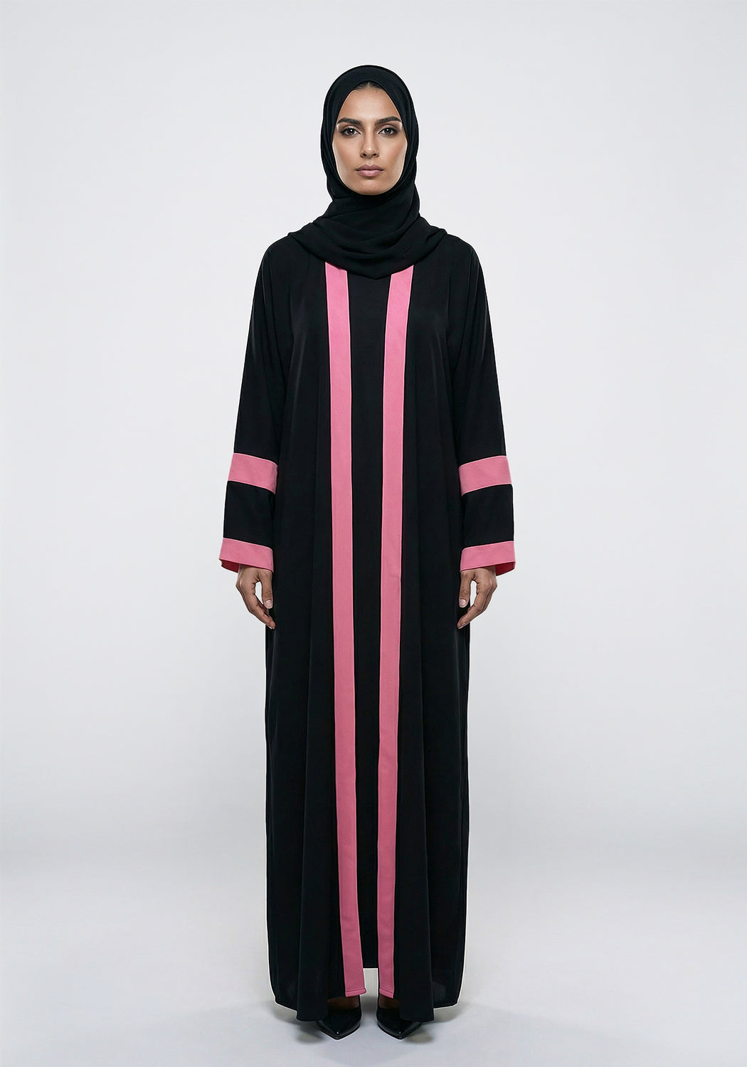 An ultimate fusion of style and elegance. Tailored with nada fabric, a double-layered abaya with the inner attached. Adorned with stunning shocking pink trimmings on sleeves and front. A perfect blend of modesty and fashion-forward design.