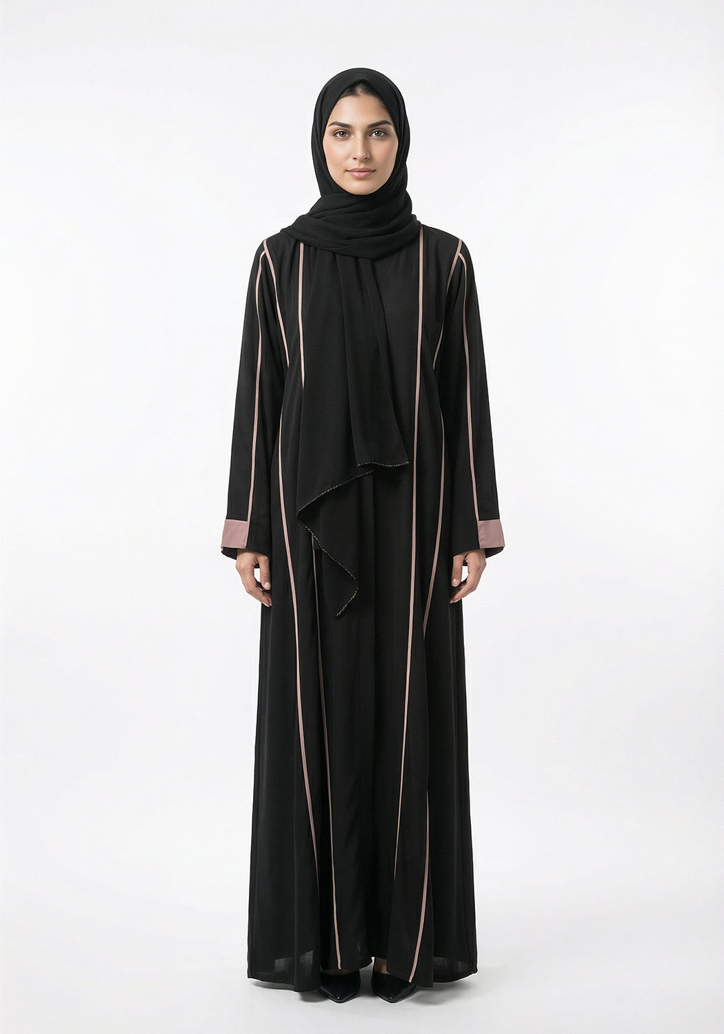 Elevate your modest wardrobe with our black front-open abaya, featuring vintage pink piping along the length of the abaya and sleeves, with matching vintage pink bordered sleeves for a stylish, elegant contrast. Complete with a black scarf, this abaya offers a coordinated and polished look, perfect for everyday wear.