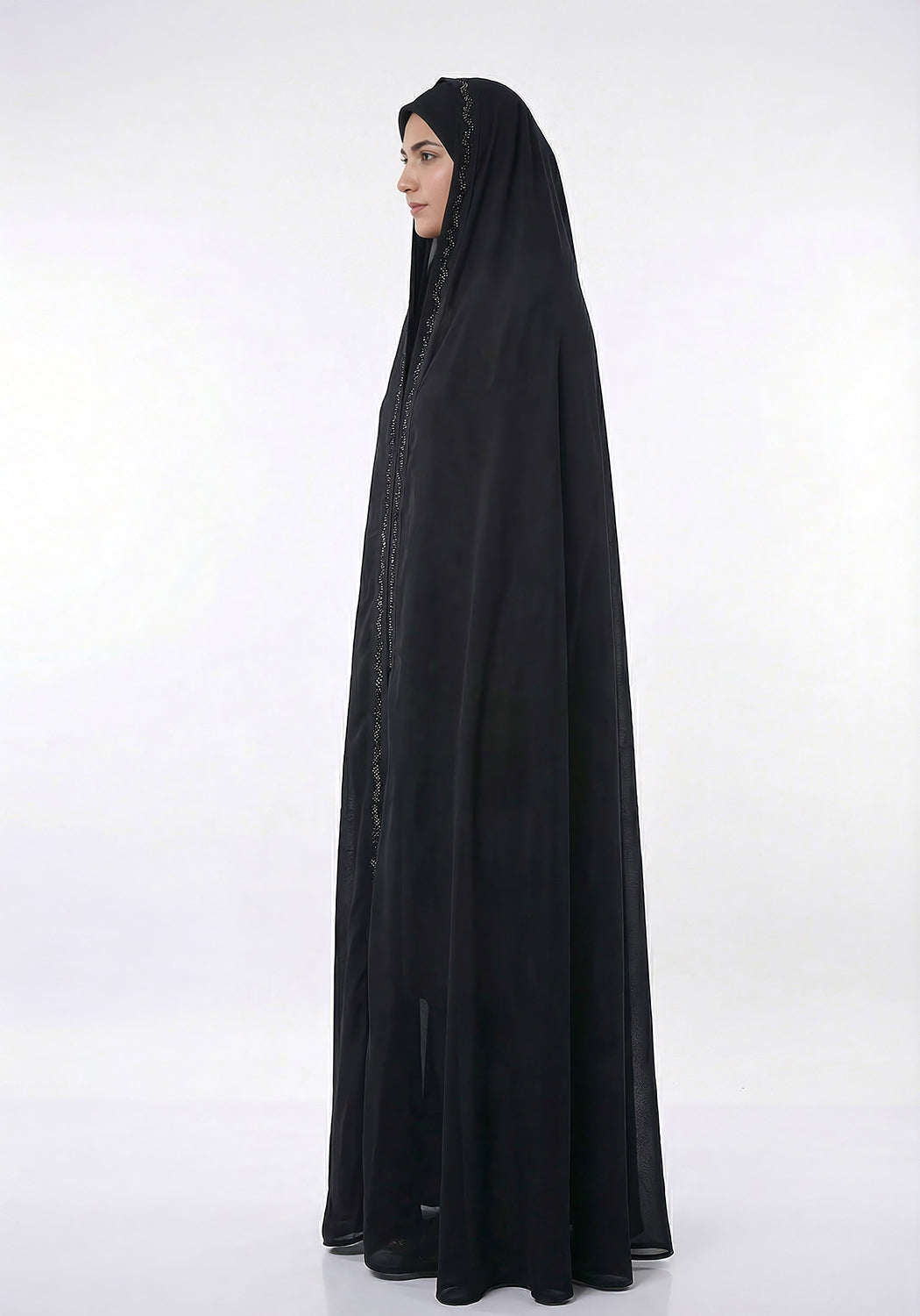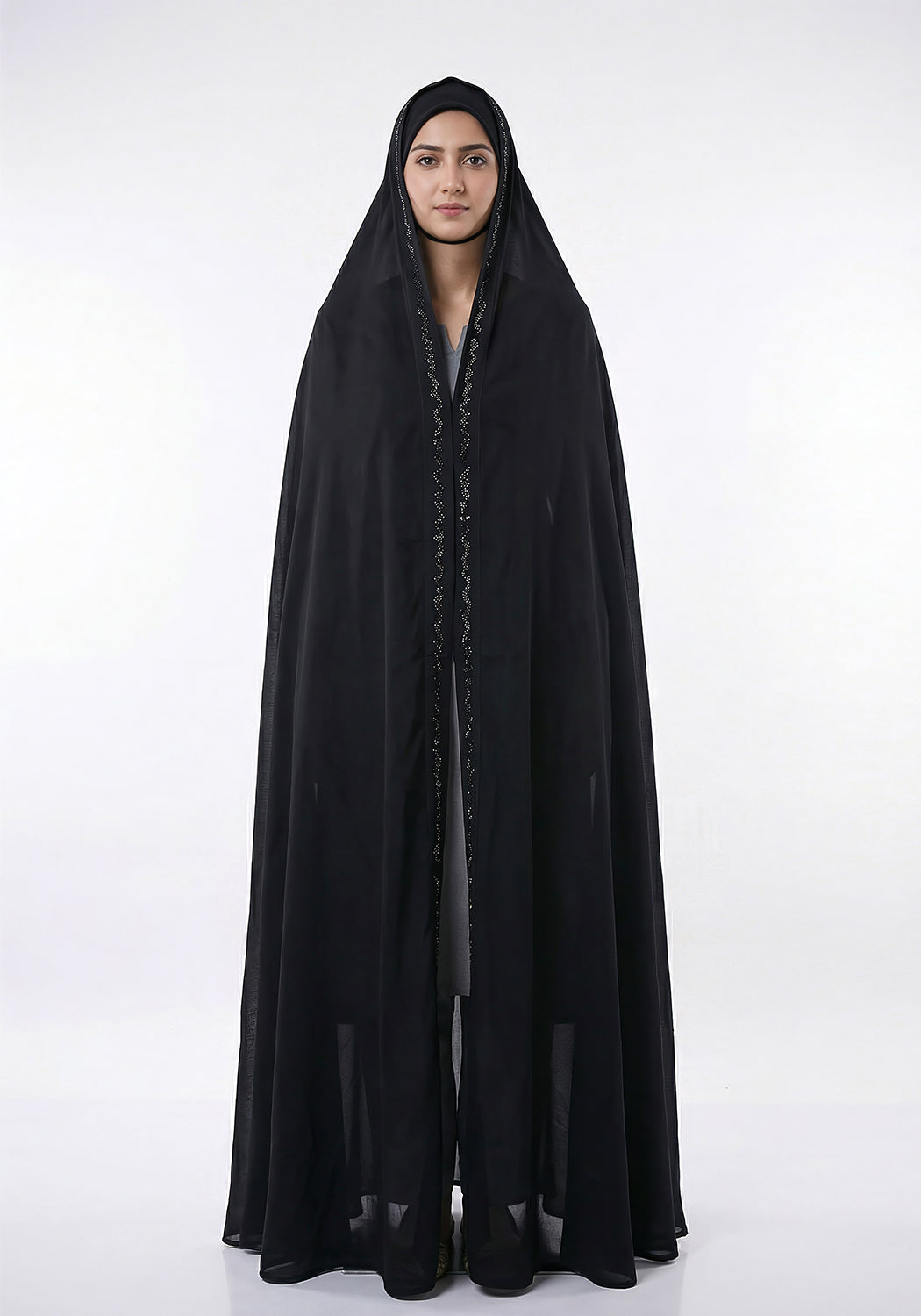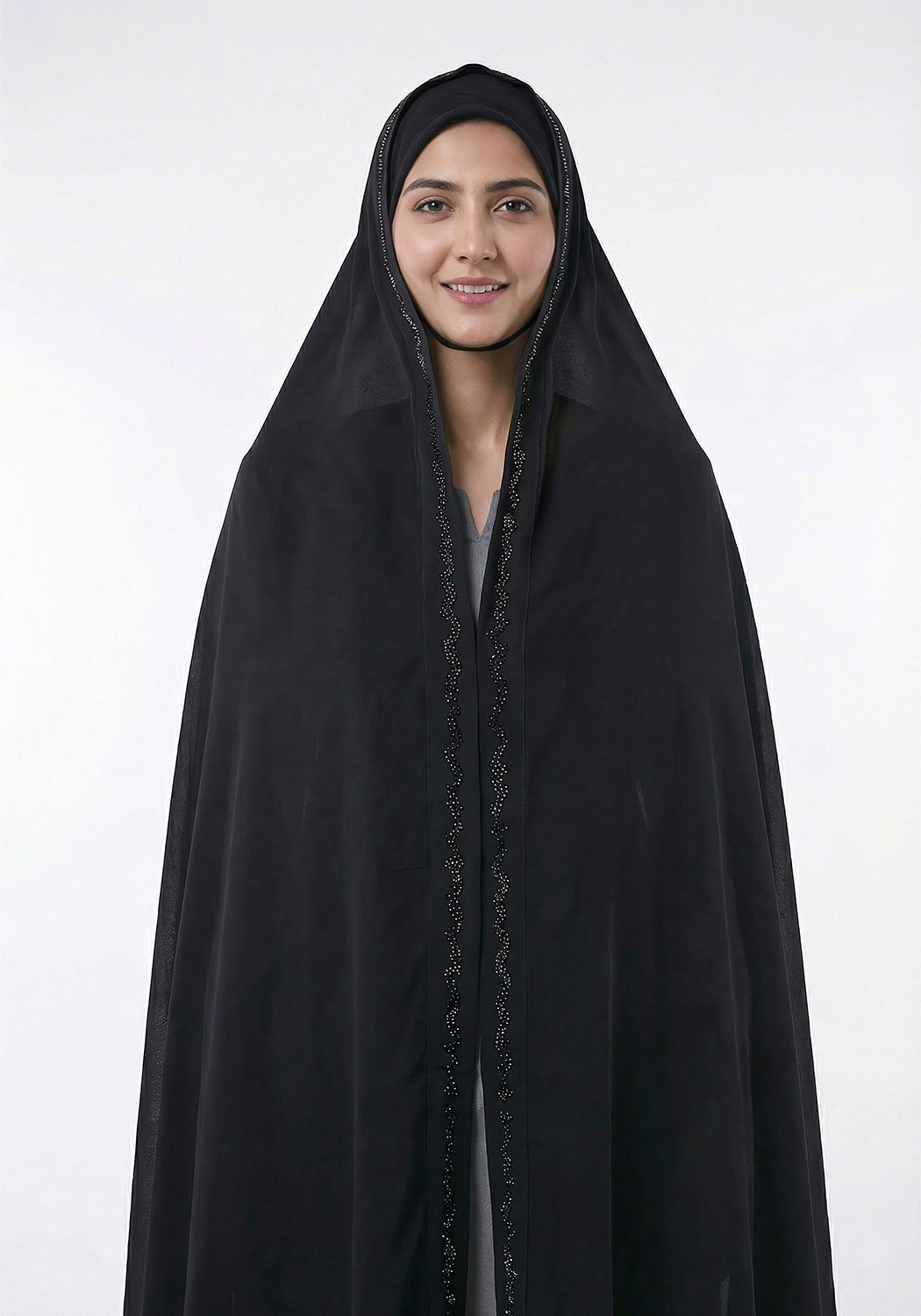 Elevate your modest wardrobe with this exquisite Irani Chadar, adorned with intricate DMC stone work along the border. Each stone is meticulously hand-placed to create a stunning embellished edge that catches light beautifully. Perfect for special occasions, prayers, or everyday elegance, this chadar combines traditional craftsmanship with timeless sophistication. The delicate stone detailing adds luxury and dimension while maintaining the graceful drape of authentic Irani styling. A premium piece for those who appreciate handcrafted quality and refined details.